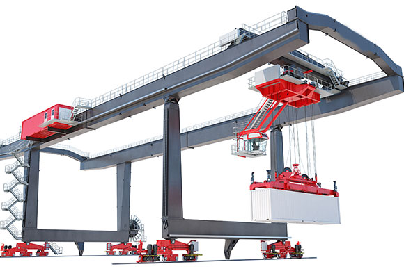 Рельсовый кран-голиаф-кран (кран RMG) в основном используется для загрузки, выгрузки, перемещения и штабелирования контейнеров на железнодорожных перевалочных площадках и больших складских площадках для хранения контейнеров. Он состоит из основной балки, жестких и гибких выносных опор, механизма перемещения троллей, подъемного механизма, механизма перемещения крана, электрической системы и кабины управления.